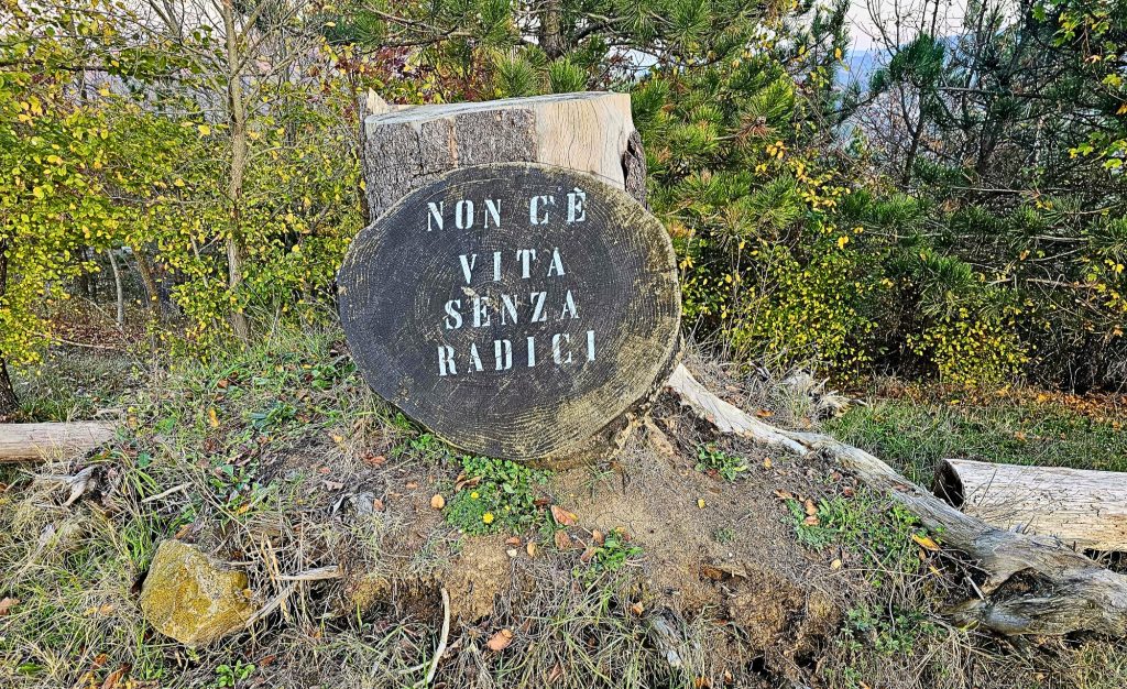 Arrivati sul posto il tronco di un albero ci guida verso il viale d’accesso, come un invito a noi dedicato. Una frase incisa nel legno recita: “Non c’è vita senza radici“, un sorriso si apre allora sui nostri volti e ci sentiamo subito accolti e invitati a procedere, come spinti dal vento che ci guida verso l’entrata.